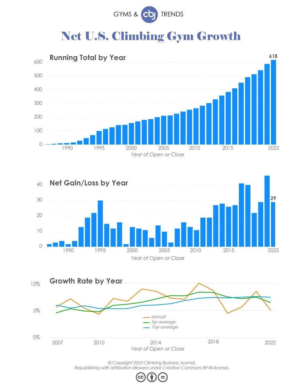 Even though the number of new gyms that opened in 2022 represent a decline compared to 2017, 2018 & 2021, 32 net new gyms opened annually in the U.S. on average over the past 10 years, which represents an all-time high, according to Climbing Business Journal.